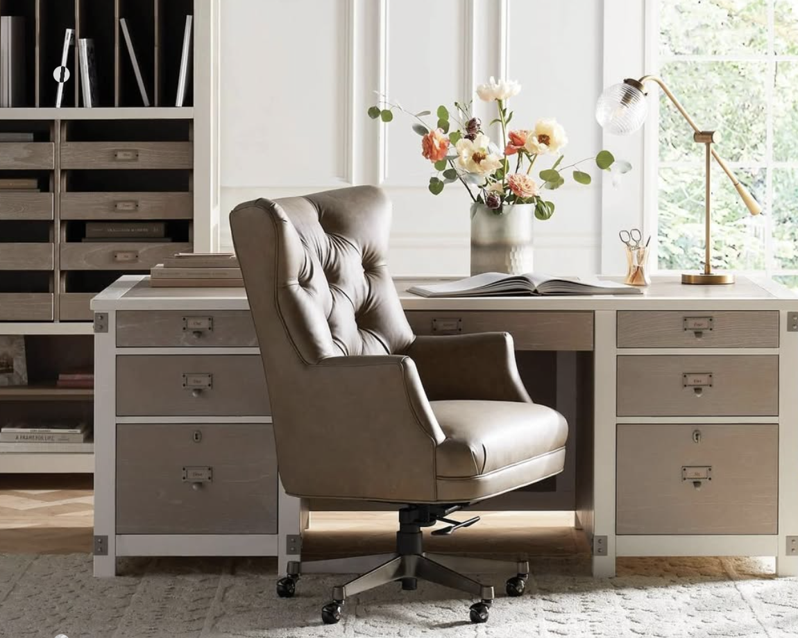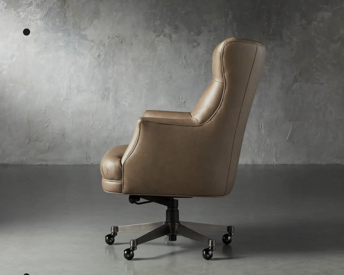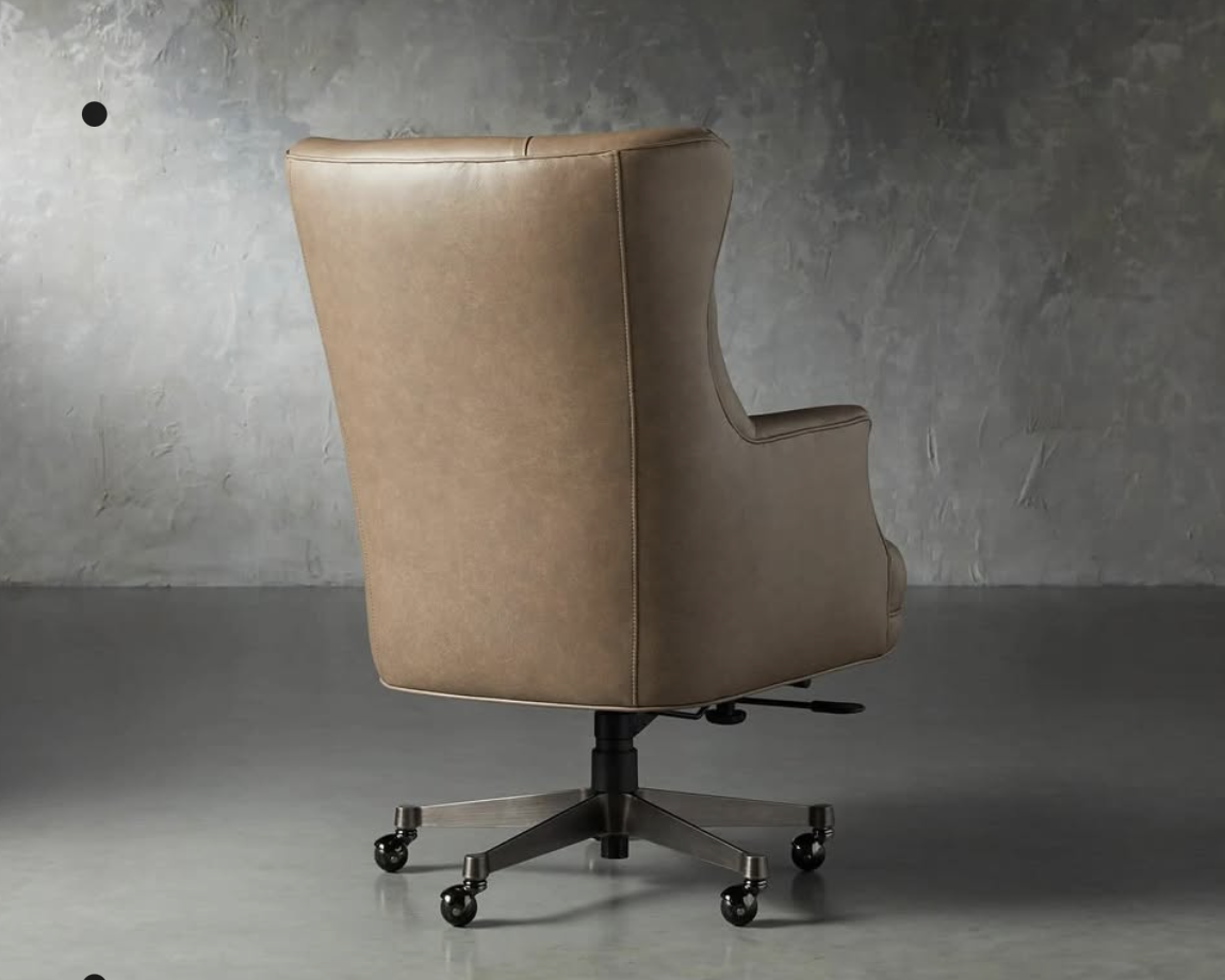 Our extravagant Addy Executive Chair is luxuriously designed to elevate your work space. Expertly upholstered, hand-finished leather is hand-sewn onto curved wing backs accentuated by hand-tufted detailing. Contoured back cushions create lumbar support with seats sustained by resilient heavy-duty webbing for reliable comfort. And, metal bases equipped with brass castors and pneumatic lift mechanism allow chairs to tilt and swivel into any desired position.