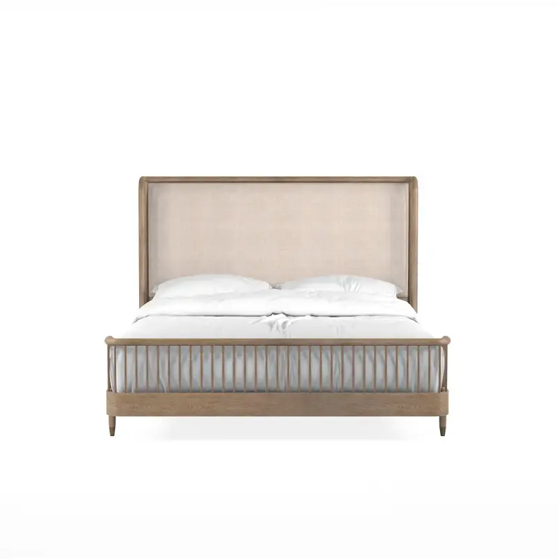 A sense of structured beauty makes this bed the centerpiece of any space. A dramatic 64? headboard and mid century-style spindle rail with tapered legs add a bold vertical element to the bedroom, softened by gently curved corners and a central panel upholstered in a woven fabric. The frame is beautifully finished in a warm grey elm veneer that suits many styles of decor. Classic vintage elements inspired the Finn collection, celebrating the birth of mid century modern design with an updated perspective that suits the 21st century aesthetic. Simple, clean lines and solid heirloom quality construction are complemented by rounded forms and the organic beauty of wood grain and natural hand-applied woven raffia, creating a beautiful study in contrast.
