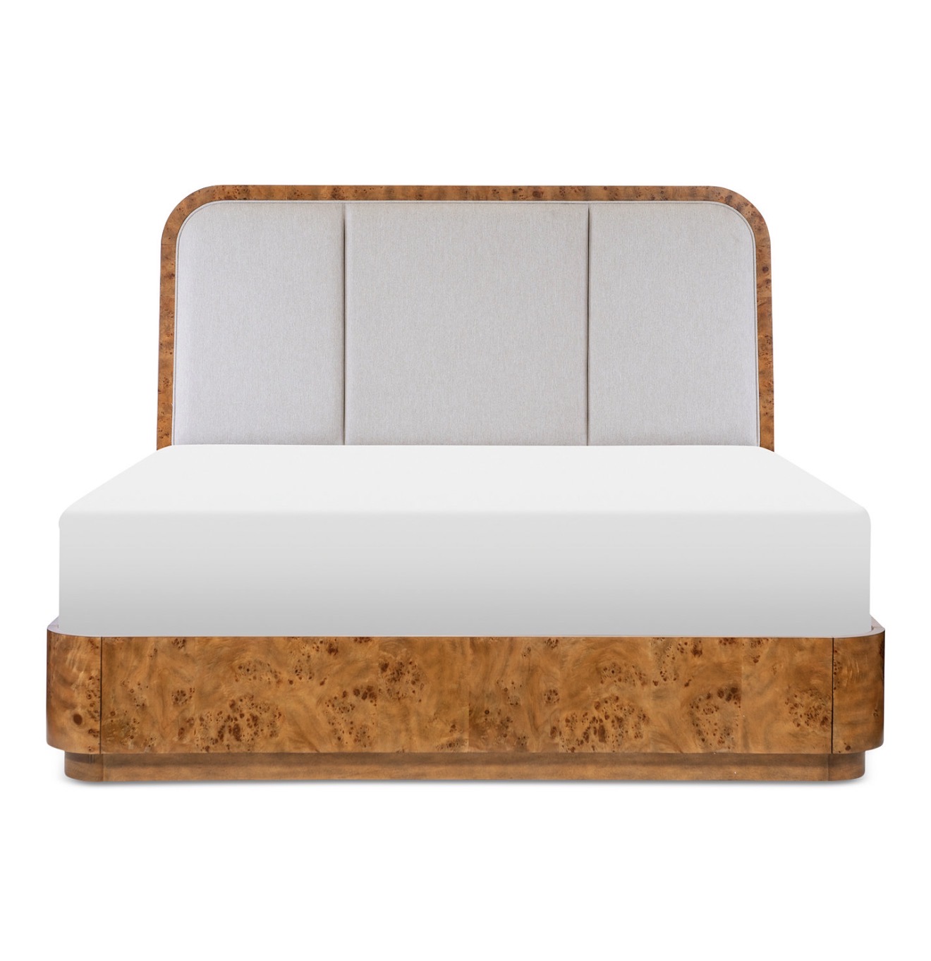 Constructed of Select Hardwoods and Mappa Burl Veneers with a 90% Polyester, 10% Nylon upholstered headboard