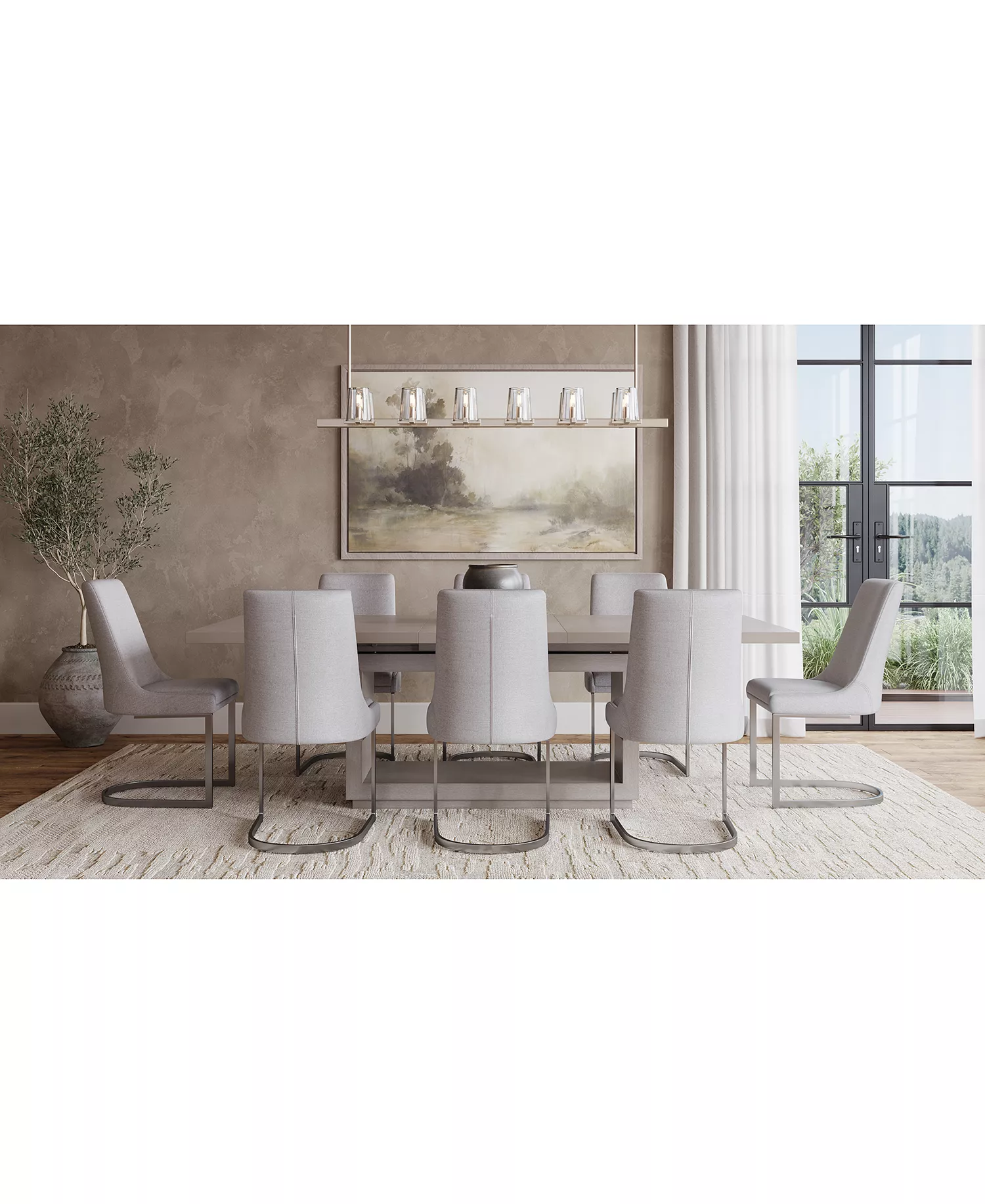 The Tivie Rectangular Dining Table is sleekly tailored with crisp lines and a beautiful weathered finish. The table is smartly accented with a floating plinth base. The Tivie Dining Chair features a modern metal base, bound to make a striking impression.