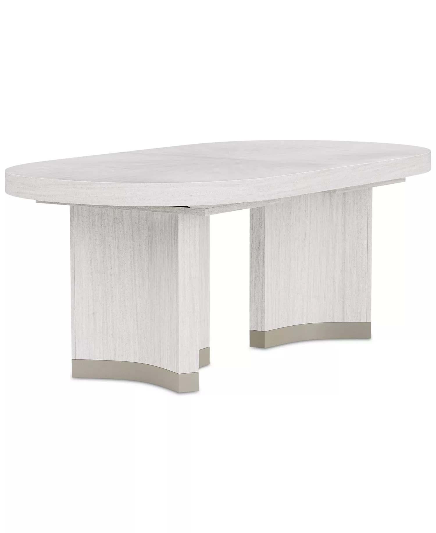 - Double pedestal bases have three concave sides forming a unique dining table shape.